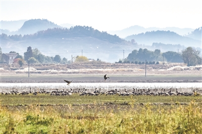 冬日里,迁徙的候鸟成群结队,它们或休憩水面、或觅食浅滩、或遨游天际,形成了一幅万鸟翔集的壮观画卷。