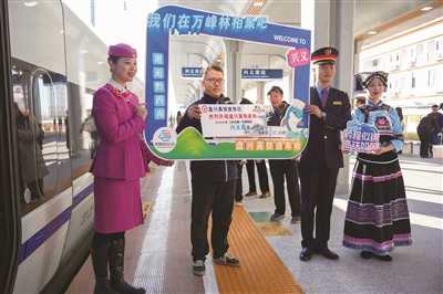 11月28日,旅客在兴义南站和乘务员合影留念(左图);一列动车组列车经过盘兴高铁北环线特大桥(右图)。