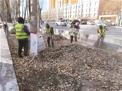 冬季落叶积存不仅容易滋生病虫害,也存在防火隐患。近日,记者在黄河路看到,青海国盛园林绿化有限公司的工人们或挥帚清扫,或持机吹叶,正集中清理绿化带内的枯枝落叶和杂草垃圾。“我们每天分组分段作业,清扫、吹风、打包,同步清理砖石杂物,确保责任区域干净整洁。”养护工人张生莲说。