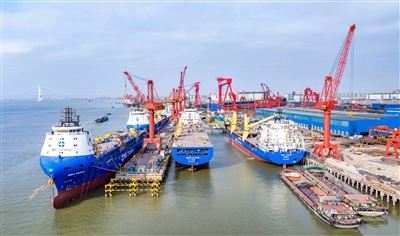 12月15日,在位于江苏省泰州市高港区的泰州三福船舶工程有限公司生产基地,多艘大型船舶在建造中(无人机照片)。