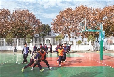 12月16日,轧村中学的学生们在阳光大课间活动中进行篮球比赛。