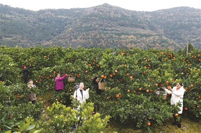 12月12日,在四川省广元市苍溪县陵江镇笋子沟村,村支书张桂华(前)在果园里直播带货,销售柑橘。