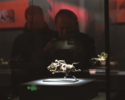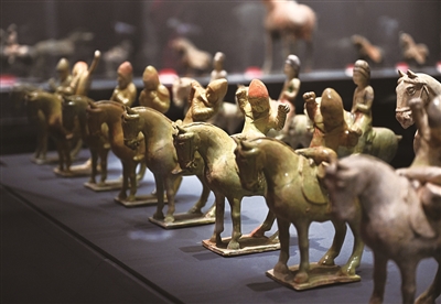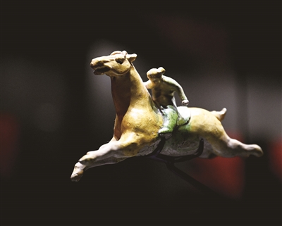 展览中,多件汉、唐时期的骑马俑极富动感,其中一件汉代绿釉勇士骑飞奔马俑尤为传神,骏马三蹄腾空、作疾驰状,马背上的武士挎弓持刀,神情冷峻,仿佛正传递紧急情报。