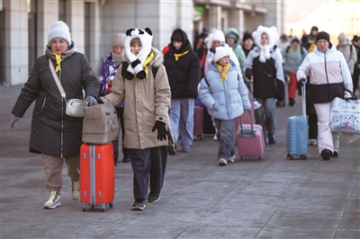1月8日,在绥芬河火车站出站口,游客前往宾馆。