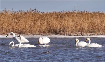 “1只、2只、3只……那边有三只天鹅!”监测人员迅速报数。话音未落,不远处的水面上,一群水鸟扑棱着翅膀腾空而起,掠过水面飞向远方。监测人员调整观测方向,拿起设备转向水域另一侧,好像又发现了“珍宝”。