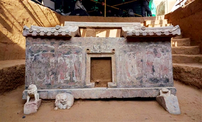 西安百花村北周成夫人墓是一座北周时期高等级贵族墓葬,其中一座房型石椁造型精美,图像内容以牛车鞍马图为主要表现题材,并配以飞天乘龙、仙人御虎等升仙主题。四川大学文科讲席教授、北京大学考古文博学院教授李水城说,这一墓葬既有鲜明的粟特文化特征,又保留了中原文化特色,是北周时期文化交流融合的典型例证。