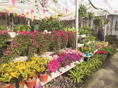 走进花卉基地的花棚,暖意裹挟着花香扑面而来,各色年宵花次第绽放,将偌大的花棚装点成五彩斑斓的花海。顾客们穿梭其间精心挑选心仪的花卉,处处洋溢着姹紫嫣红的喜庆氛围。一处三角梅展销区吸引了众多顾客驻足,白色、粉色、红色、玫红色的花朵簇拥枝头、花团锦簇,大家或对比花色,或商讨价格,或询问养护技巧。花架之间,商户们来回穿梭、忙得不亦乐乎。“马上就要过年了,年宵花已经进入销售旺季,一到周末客流量特别大,杜鹃花、三角梅、海棠、蝴蝶兰等都是畅销品种。”店主刘爱娟一边和员工修剪花枝、开展基础养护,一边忙着向顾客介绍花卉养护方法。