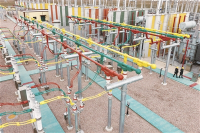 1月19日,工人在位于河北省宁晋县境内的国网邢台北500千伏超高压变电站巡检(无人机照片)。