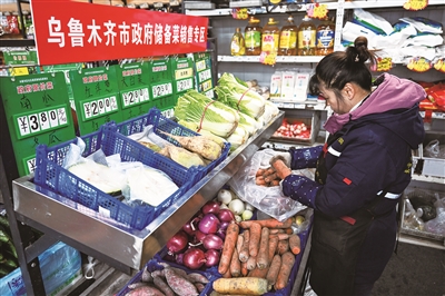 在新疆乌鲁木齐市水磨沟区六道湾街道南湖花苑社区蔬菜副食品直销点,工作人员在政府储备菜销售专区整理蔬菜(1月20日摄)。