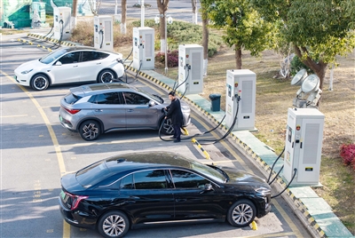 1月22日,车主在江苏泰州电暖流城市服务中心电动汽车快充站内为车辆充电(无人机照片)。