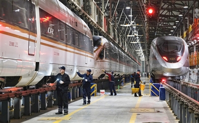 2月2日,工作人员在天津动车客车段天津动车运用所检查车体。