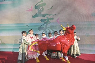 2月4日,“春姑娘”“牛童”手持花枝鞭打春牛。