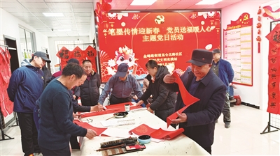金峰路街道昆仑北路社区党支部在社区新时代文明实践站组织开展“笔墨传情迎新春 党员送福暖人心”主题党日活动,特邀辖区书法爱好者为社区居民书写春联和“福”字。活动现场翰墨飘香、暖意融融。红纸黑字,笔墨含情,既有辞旧迎新的美好愿景,也有对平安吉祥的真诚寄托。支部党员和社区工作人员在现场积极协助,引导秩序、铺纸晾字、分发春联,并与居民沟通交流,倾听大家的意见建议。一副副寓意吉祥的春联和一个个满载祝愿的“福”字被赠送到居民手中。同时,社区志愿者与辖区共建单位共同为社区高龄老人、残疾人、低保家庭、退伍军人等群体上门赠送春联和“福”字,为2户困难家庭送去米、面等慰问品,并详细了解他们的生活需求,传递党组织的关怀与温暖。
