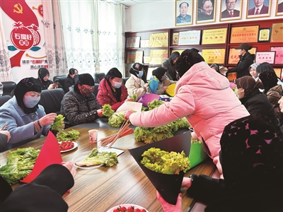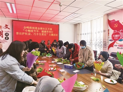 金南社区开展的“巾帼绽芳华,健康伴同行,普法护权益,巧手生菜花”主题活动丰富多彩。邀请辖区卫生服务站医生开展健康讲座,围绕女性常见病预防、科学养生、心理调节等内容进行讲解,帮助辖区妇女提升健康意识、养成良好生活习惯。法律顾问则通过案例解析、发放资料、现场答疑等方式,普及维权知识,增强妇女的法律意识和自我保护能力。在巧手创意环节以新鲜生菜为主材料制作花艺作品,让妇女在动手实践中感受生活乐趣。