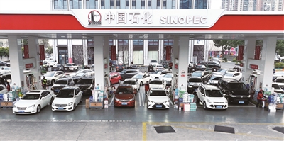 3月9日,汽车在江苏省常州市一加油站内有序加油(无人机照片)。