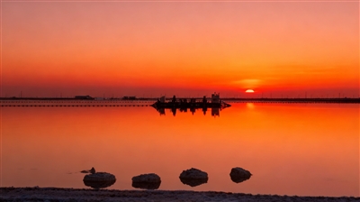 黄昏时分,察尔汗盐湖的湖面如镜,倒映着熔金般的霞光与采盐设备的剪影,自然景观与工业文明在此交融。 记者 宗布尔 摄