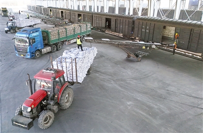 3月17日,工人在位于绥化市的哈尔滨铁路物流中心绥化营业部农资装卸作业现场卸化肥(无人机照片)。