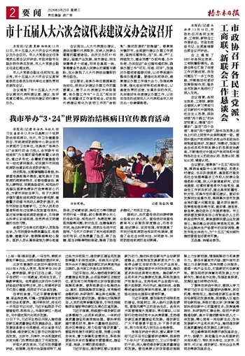 本报讯(记者 张金凤 马俊杰 实习生 盛留存)3月24日是第31个世界防治结核病日,当天,市卫生健康委员会、市疾病预防控制中心联合我市39家医疗卫生单位,在奥体广场举办以“全面行动 全力投入 全民参与 终结结核”为主题的宣传教育暨义诊活动,通过多形式、全覆盖的健康宣传与一站式便民服务,切实提升市民结核病防治意识和自我防护能力。