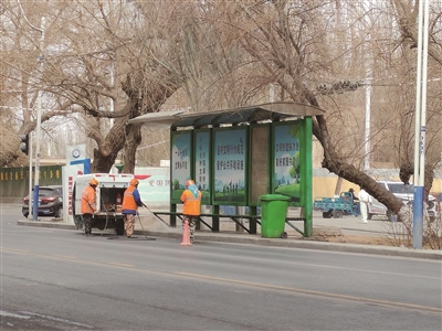 为给市民营造干净整洁的候车出行环境,全面提升城市窗口形象,近日,市城市管理综合行政执法局开展城区主次干道两侧的公交站点清洁行动。图为保洁人员清洗公交站台。
