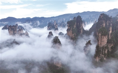 3月27日,一场春雨过后,湖南张家界国家森林公园出现壮美的云海景观,洁白的云雾在陡峭的峰林间蒸腾变幻,宛如水墨画卷。