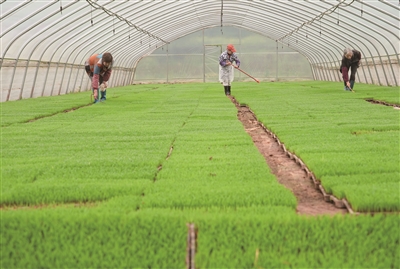 3月30日,农民在湖南省衡阳市祁东县归阳镇煜东种植养殖专业合作社的大棚育秧基地进行早稻育秧管护工作。