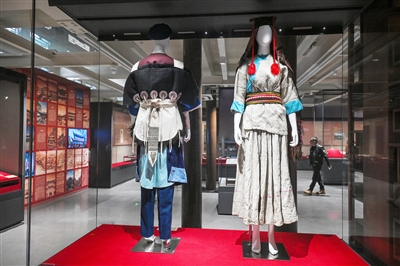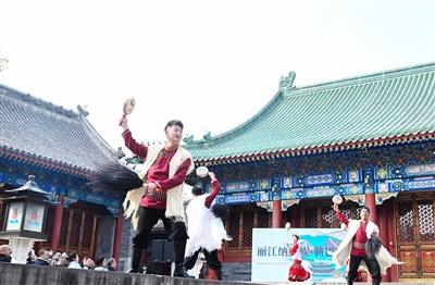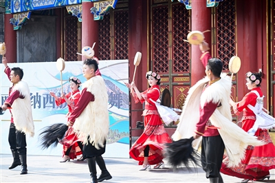 (图一)3月30日,演员在开幕式上表演纳西族勒巴舞;(图二)3月30日,演员在开幕式上表演纳西族勒巴舞;(图三)3月30日,观众拍摄展出的神路图;(图四)这是展出的纳西族服饰(3月30日摄)。