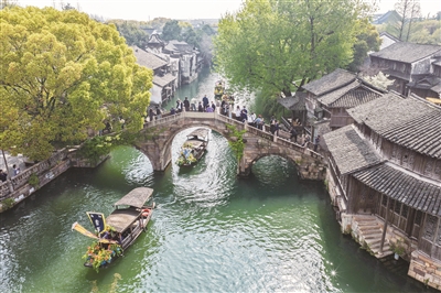 4月1日,乌镇香市蚕花盛会的船队在河道上巡游表演(无人机照片)。