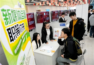 4月2日,求职者与参会企业工作人员在杭州市高校毕业生就业专场招聘会上洽谈。