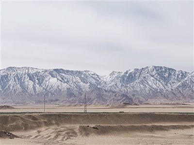 连绵起伏的昆仑山脉被皑皑白雪覆盖,在澄澈的天空下勾勒出磅礴的轮廓。山脚下的戈壁滩与雪山相映成趣,苍茫大地间,输电铁塔静静伫立,为这片壮阔山河增添了一抹现代气息。 记者 张丹丹 摄