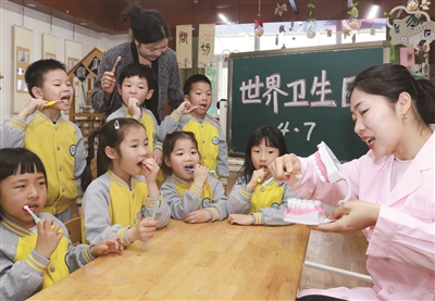 4月7日,湖北省武汉市江岸区快乐天使幼儿园老师为小朋友们示范正确的刷牙方式。