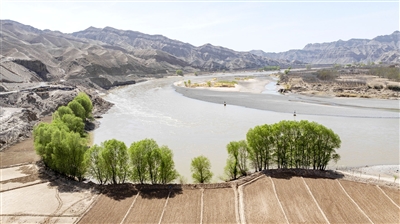 春日的宁夏中卫市南长滩村,黄河水蜿蜒流淌,岸边绿芽初绽,村里梨花竞相开放,勾勒出一幅生机盎然的黄河春景图。