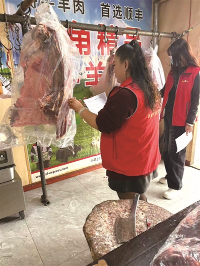 排查中,社区工作人员深入辖区内牛羊肉经营场所,开展全覆盖检查。逐项核验商户的营业执照、食品经营许可证及从业人员健康证等资质是否齐全有效。同时,现场甄别肉品外观、气味、色泽是否正常,检查冷藏冷冻储存条件是否符合标准,严防变质、“三无”、白板肉、注水肉等问题肉品流入市场。严禁私屠滥宰、掺假掺杂、非法添加等违法违规操作,督促商户严格落实索证索票和进货查验制度,做到诚信守法经营,确保肉类及其制品安全。