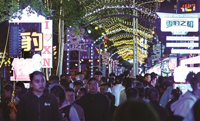 在如今的西宁,雪豹早已融入这座古城的各个角落。城市商业区的裸眼3D大屏上,雪豹在楼宇间奔跑跳跃;道路斑马线上,雪豹足迹图案指引着行人前进;美食街沿线的墙面上,雪豹彩绘成了最吸引人的打卡背景……